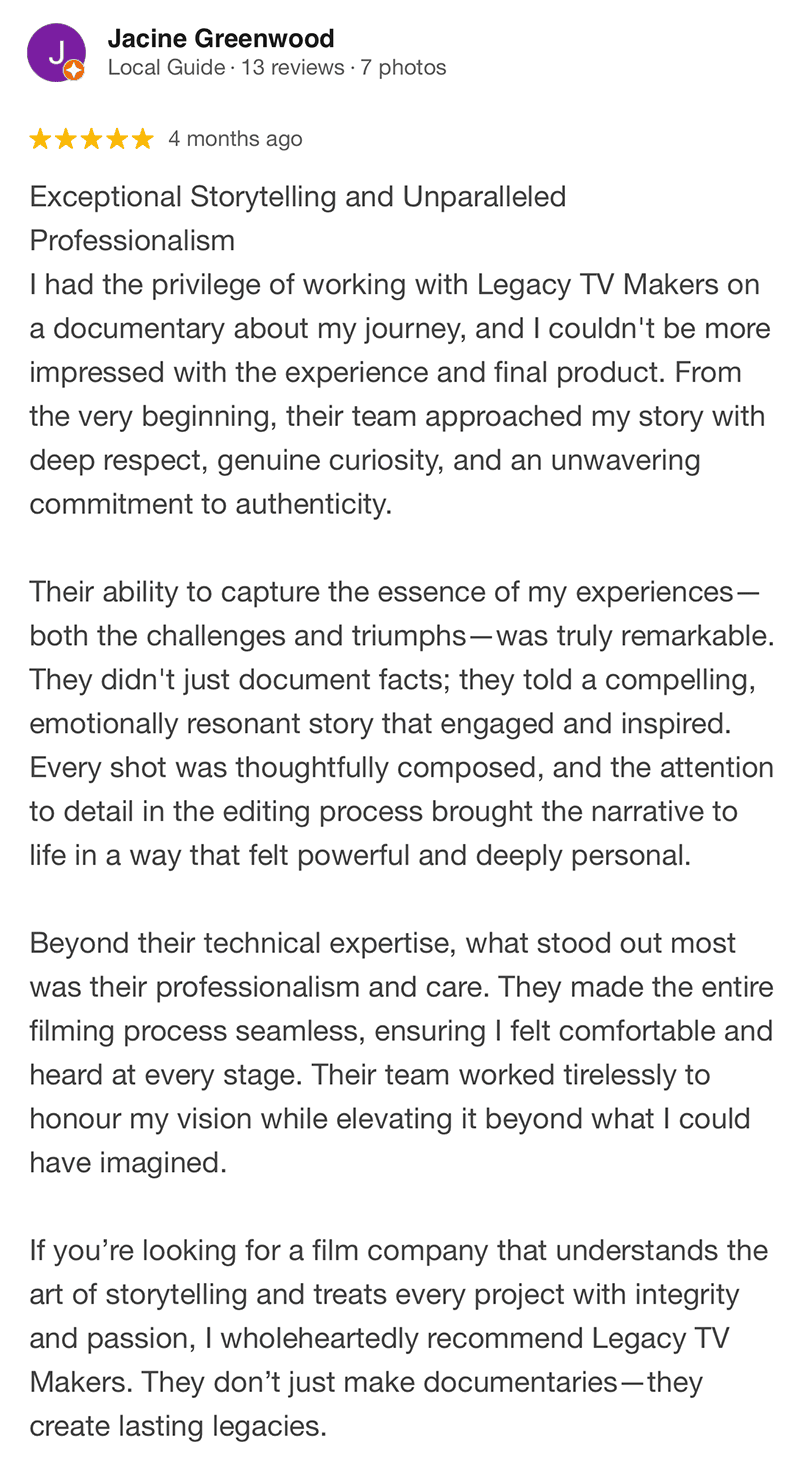• We provide you with a detailed brief to help plan and film your interview locally. You have the flexibility to work with a videographer of your choice, making it a more cost-effective option.